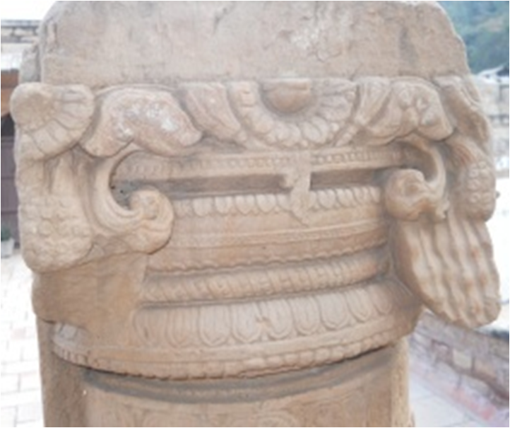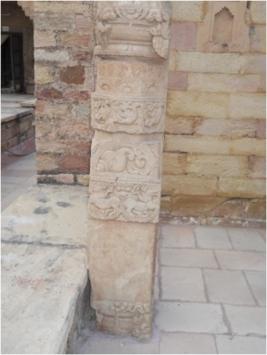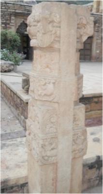 A pillar of a temple is carved beautifully, having parts from bottom of top. The lowest part adorns with ghat pallav, Kirtimukh design, second part is plain without carving topped with wingged lions and griffion band Kirtimuk. Third octogonal part is carved with floral design and birds topped with half lotus design. The bracket capital is square above circular part, containing attractive design.