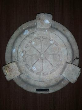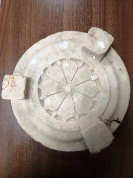 It is an architectural decorative member marked with lotus medellion like carving in white sandstone. Three rectangular shaped elelments are attached around the circular object.