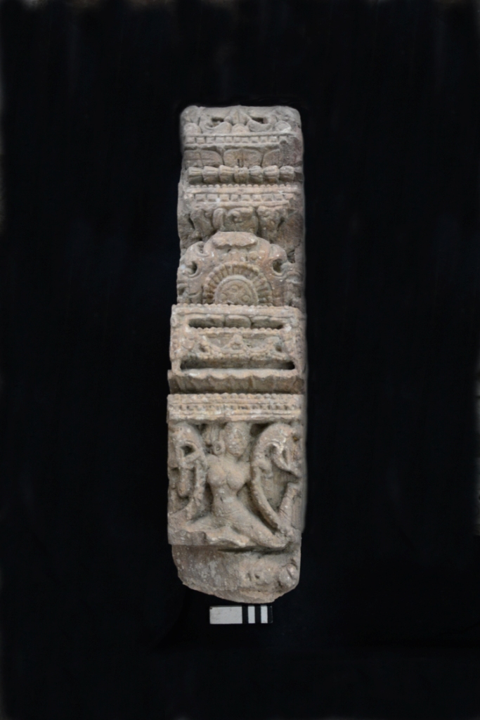 A two side decorated stone pillar having naga banta, beaded mala designs with a siting female figurine holding creepers in two hands.