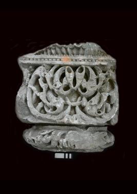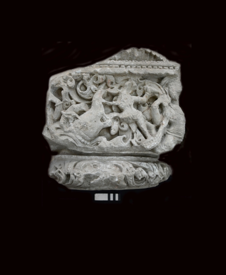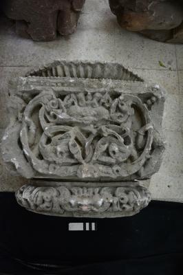 A broken part of stone pillar having floral, animal and geometrical motifs with human figurines has decorated in four sides. A human figurine suppressing an elephant. Another human figurine holding creeper in hands.