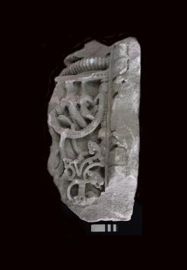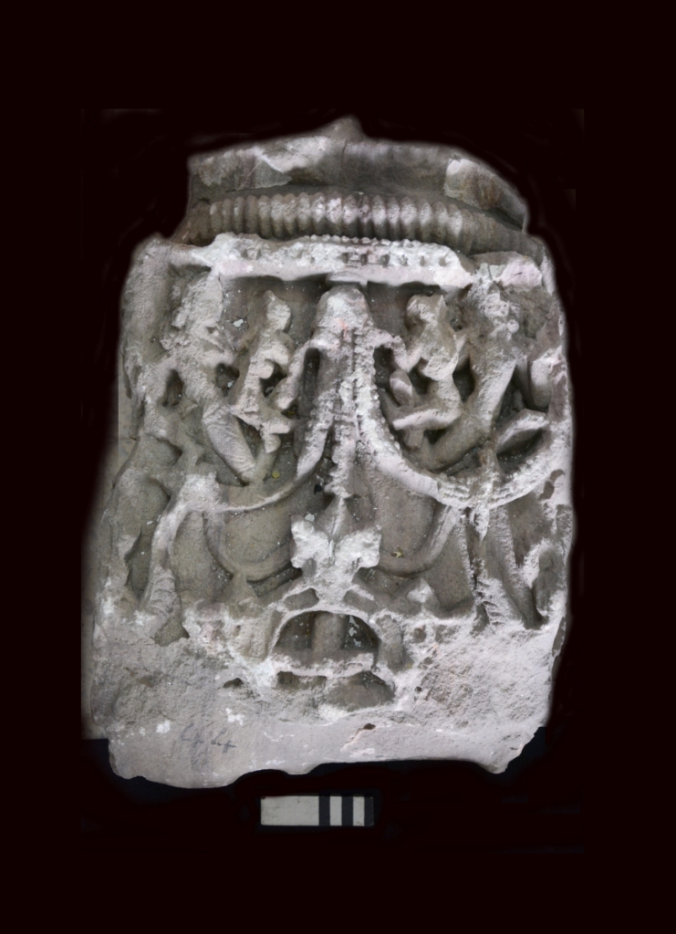 A broken part of stone pillar having floral, animal and geometrical motifs with three pairs human figurines has decorated in two sides. The pair of human figures dancing on garland of flowers.