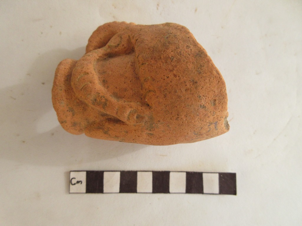 A decorated pranala. It looks like a jug. There is round handle like decoration at the outer surface, and bun shape decoration at the centre of one side.
