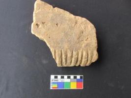 Carved brick with design of U shape carving on one side.