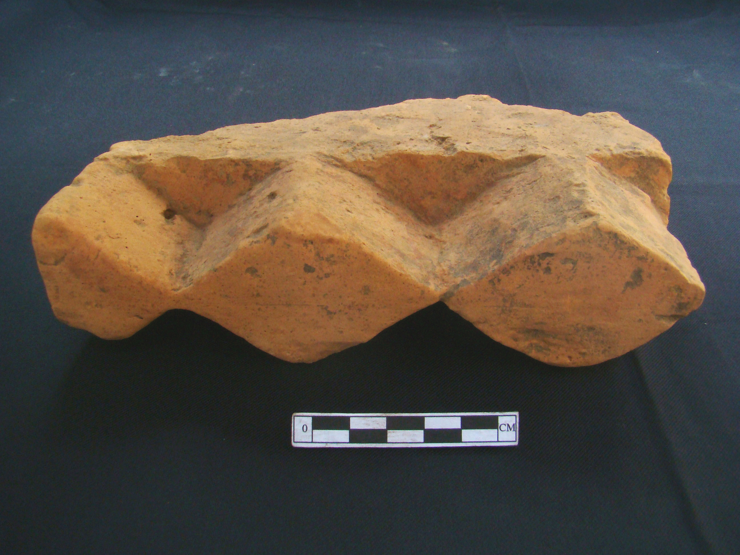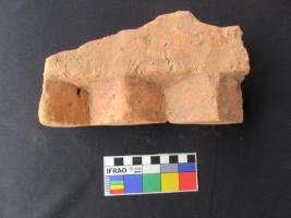 Moulded brick with three blocks of rhomboidal shape at one corner. It is light pink colour