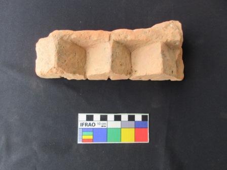 Fragment of a moulded brick, with three pyramidal blocks in one side. Incised lines are shown each centers of the pyramidal block