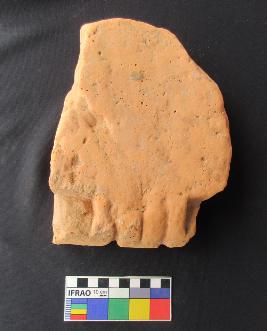 Moulded brick of two square depressions on both corner. Between this depression, one U shape design with incised line is shown in the centre
