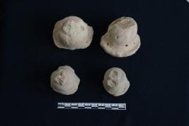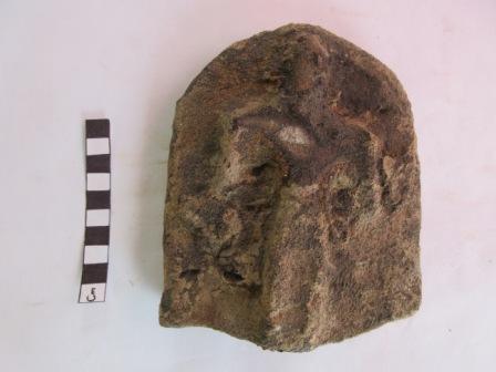 Fragmentary moulded brick with carving on the side. The carving is mutilated.