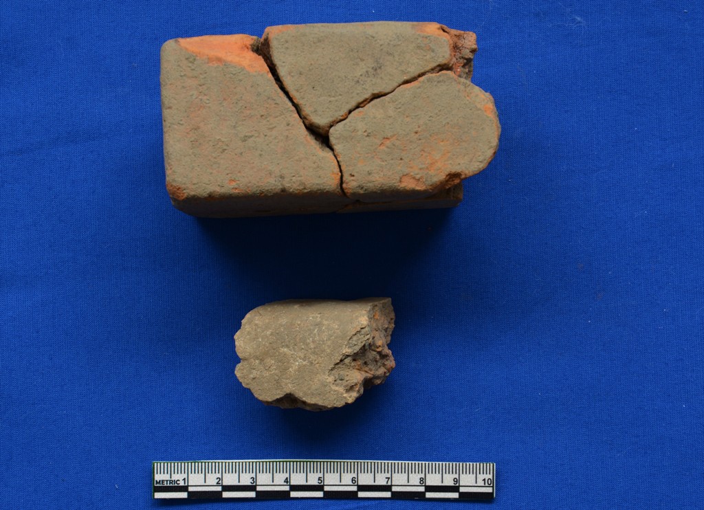 Rectangular in shape with perforation at the center, smooth surface, one end missing.