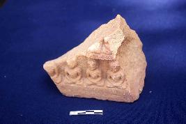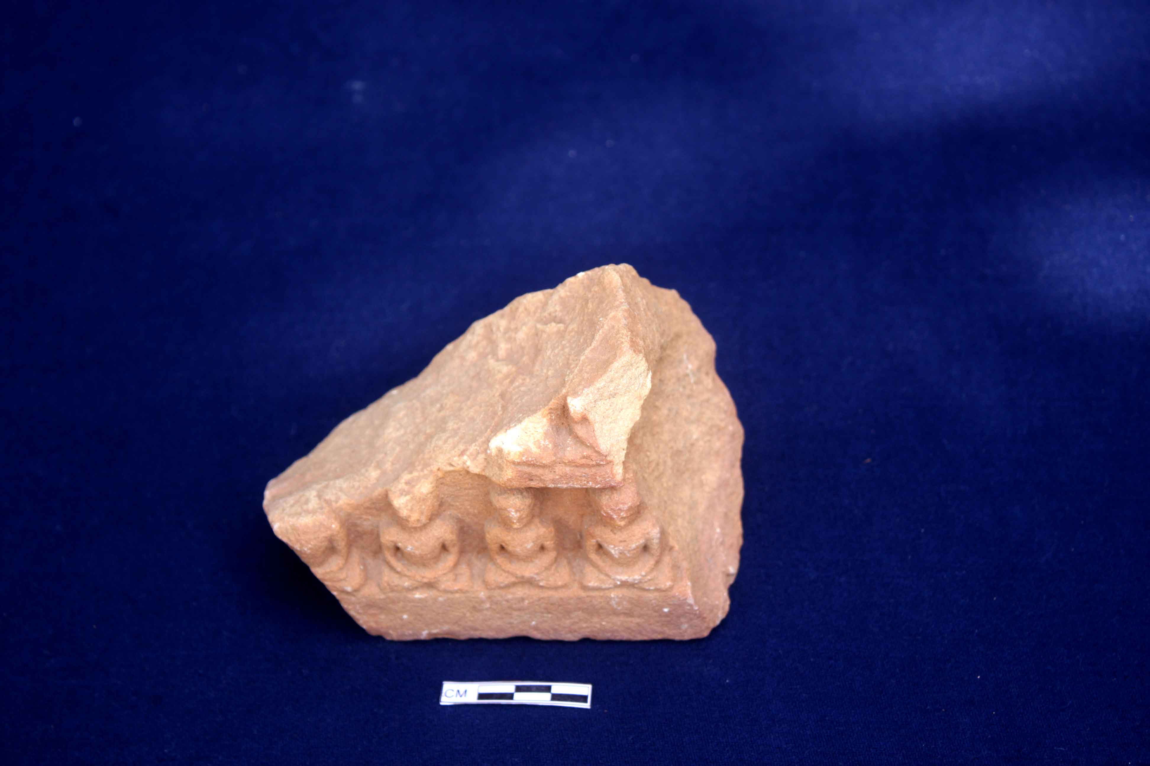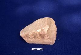 An architectural fragment of sandstone panel with depiction of four seated Buddha in a row, all in dhyan mudra. The head and knee of first Buddha from left is missing.