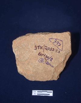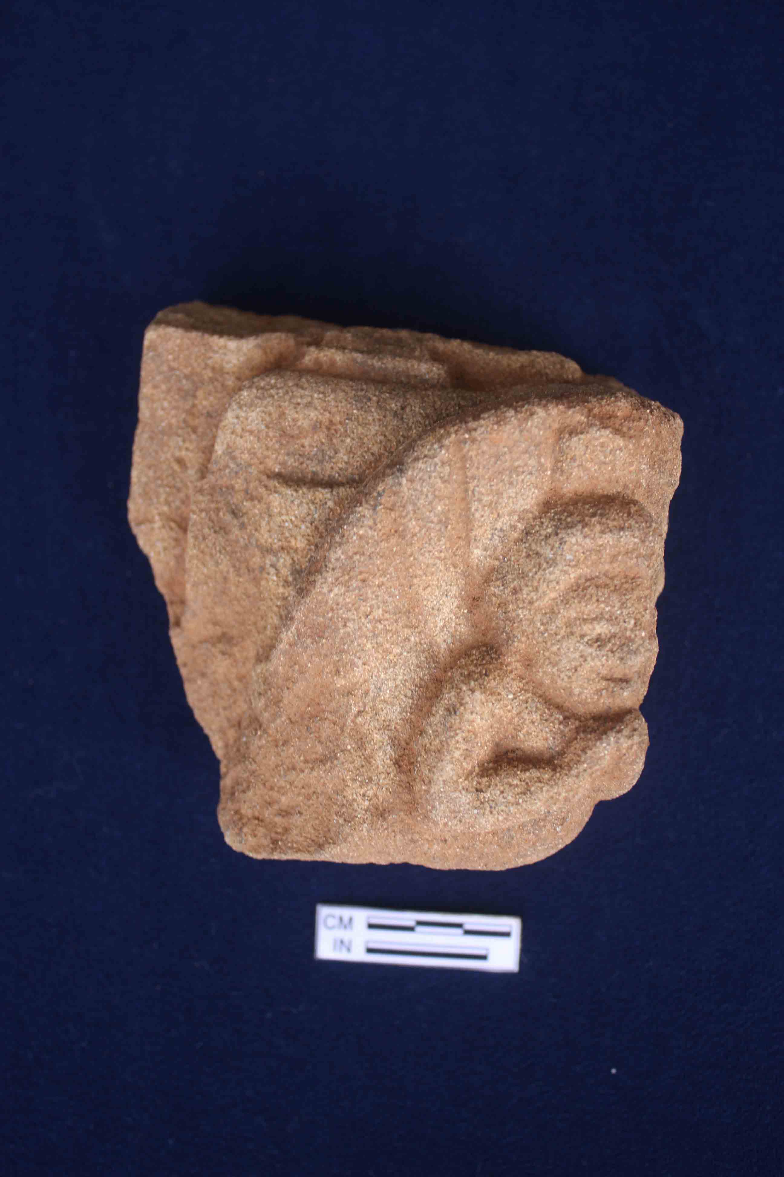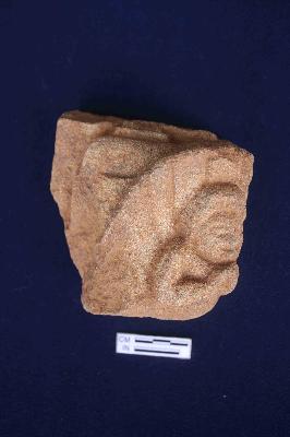It is a fragment of architectural member, a human bust is depicted with folded hands on his chest. His facial feature is not very clear due to erosion, three board lines are also depicted on his right side .
