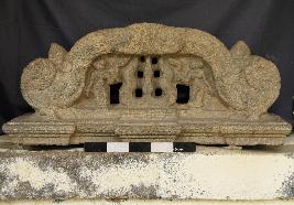 | Description / विवरण | Makara torana shows a trisula in the centre and two females holding a chowri in their right hand on either side of the trisula. The females are adorned with side bun hairstyle, ornaments and a lower garment. The torana is carved on both sides. |