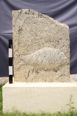 | Description / विवरण | This stone slab shows a large figure of a fish with scales and a tail fin on the back. |