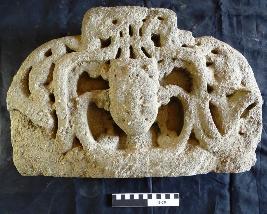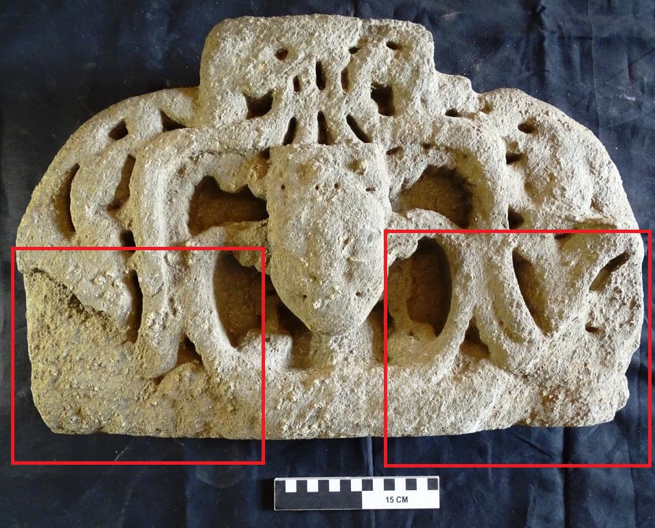The Kirtimukha is in good condition. The facial features of the mukhas face are faded.