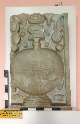 | Description / विवरण | The slab represents an ornate purnakumbha with overflowing foliage and flowers. Its three pieces are mended. it is embellished with floral bands around its neck and bulbous part. |