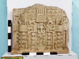 | Description / विवरण | The fragmentary slab depicts a miniature stupa wherein worship of Naga Mucalinda is shown in the centre. Jataka tales and purnakumbhas are carved on the drum part of the stupa relief. Bodhisattva worships executed on the ayagapatta. |