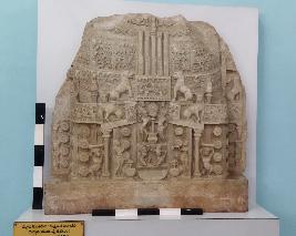 | Description / विवरण | The drum slab depicts a stupa in alto relievo worship of Dharma chakra by a couple of women seated below, a couple of men with fly whisks standing by the side of the throne, and two other devotees above. Ayakapata shows Bodhisattva in the heaven. Dome shows the birth scenes of the Lord Buddha and Mandhata Jataka. |