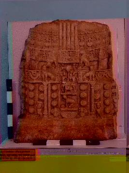 | Description / विवरण | The drum slab represents a stupa in alto relief, and Bodhi tree worship is shown in the centre. A devotee is kneeling below. The two male devotees are holding the fly whisks. Ayakapata and other scenes from Jataka stories are unidentified. A row of Purnakumbhas above the Jataka scenes. |