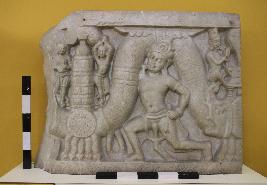 | Description / विवरण | This slab is carved with the scroll of garland and garland-bearer. Garland coming out from Makara s mouth is seen distinctly towards the extreme right. It also has curvature in the middle, meant for veneering the curved part of the dome. Towards the left, stupa worship is depicted. |