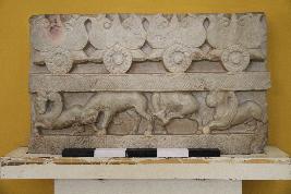 | Description / विवरण | It depicts rows of Triratna on top and animals including a lion, bull and horse below. Both rows are separated from band-bearing incised geometrical designs. Animals seem to be horses, at both extreme ends and possess wings. |