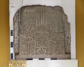 | Description / विवरण | The slab depicts the miniature stupa in bas-relief wherein worship of Dharmachakra is shown in the centre of the gateway. Dharmachakra is placed on the pillar capital which shows a lion on top. A couple of seated and standing devotees are represented on either side of it. Two kneeling devotees are carved below the three-barred railing. In the drum part of the stupa relief, scenes from Chaddanta Jataka are portrayed. |
