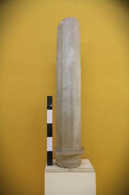 The pillar fragment is octagonal in shape with an inscription of Brahmi in the first century BCE characters in the middle part recording the gift of Utara and Khalata sons of Achinaka. The inscription reads as follows Acinaka-putana utarasa khalatasa ca thabho. The octagonal shaft rests on a Kumbha with a flared rim and prominent beading each at the neck and near the base. The Kumbha in turn rests on a lotus pedestal below which is the unfinished part.