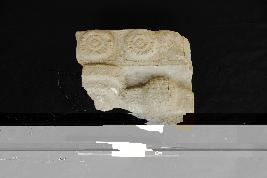 | Description / विवरण | Fragment of a Purnakumbha base with floral border showing two circular lotus designs and fruit on the right side. |