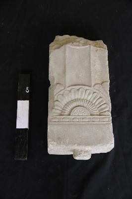 | Description / विवरण | Fragmentary upright represents a half lotus on the bead and reel border. Flutings appear above. Sockets are extant on either side and a tenon on top. |