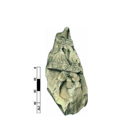 | Description / विवरण | The fragment of the dome slab shows the leg of a figure. A swan holding a flower in its mouth in the middle with beaded borders and a male figure with a raised hand and decorated headgear below. |