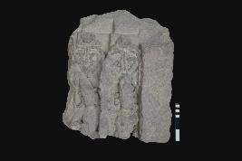 | Description / विवरण | Architectural fragment bearing one standing male and one standing female figure. The portions from the waist from both figures are missing the kiritamukutas are seen on the heads on both figures. Necklaces and chains are seen with both figures. Earrings also are present in case of both figures. The mukut portions of male figure broken. Hands also broken. Right breast chopped off. Defaced. |