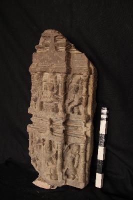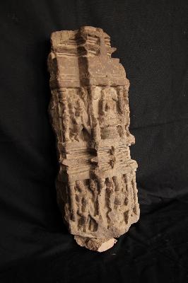 | Description / विवरण | Architectural fragment bearing a seated male deity with two standing female attendant on upper part. Iconographic features not available badly mutilated. |