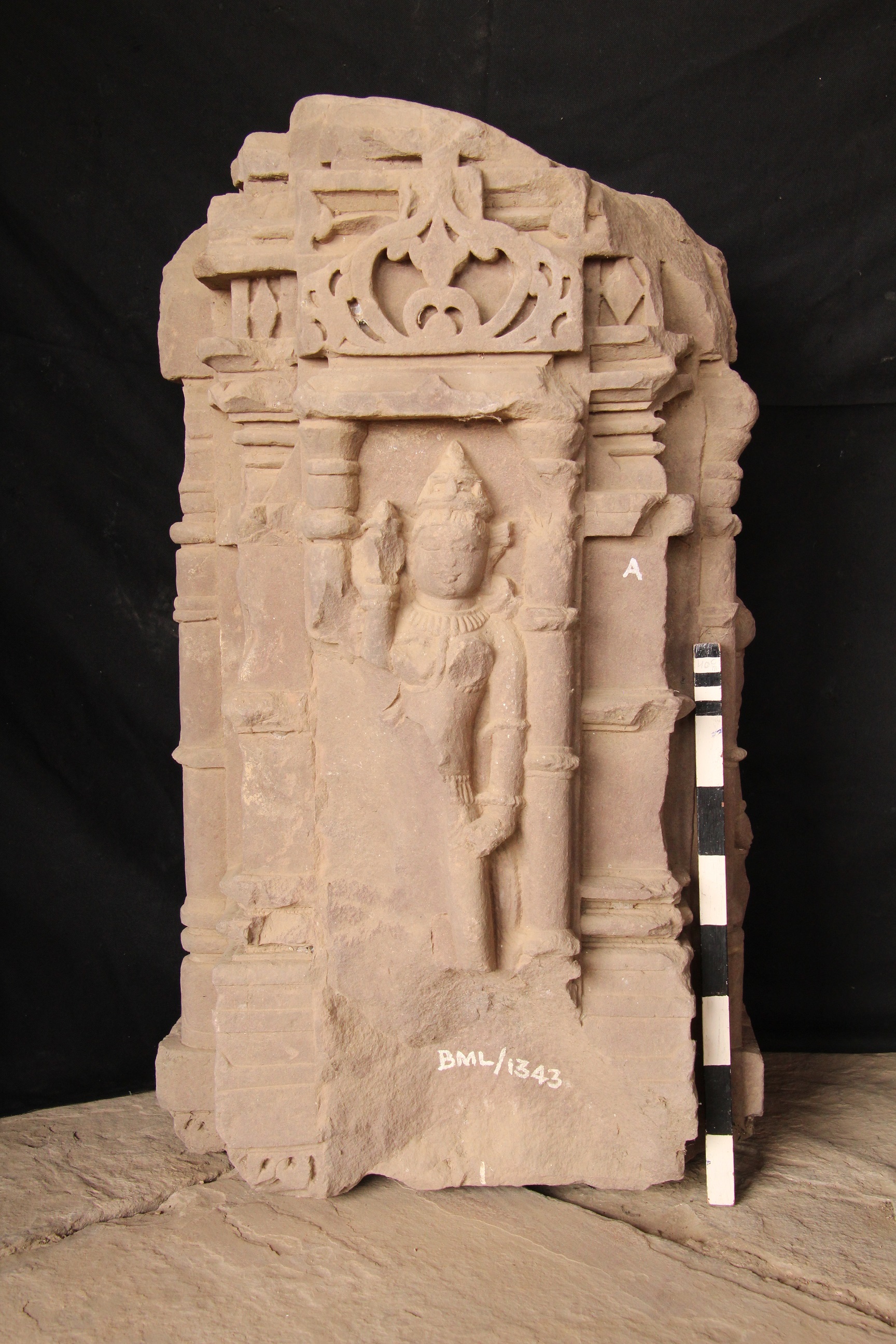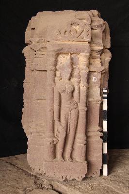 Pillar part bearing standing female figure on three sides and a flower motif on one side in niches. The left hands of female figures are up raised holding ghats and right hands rest on thighs mutilated and damaged.