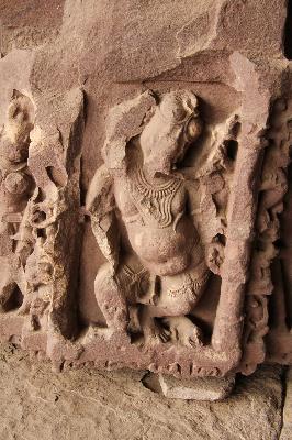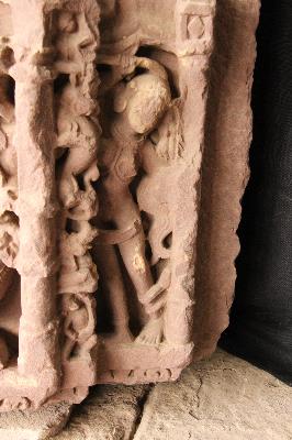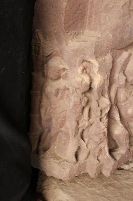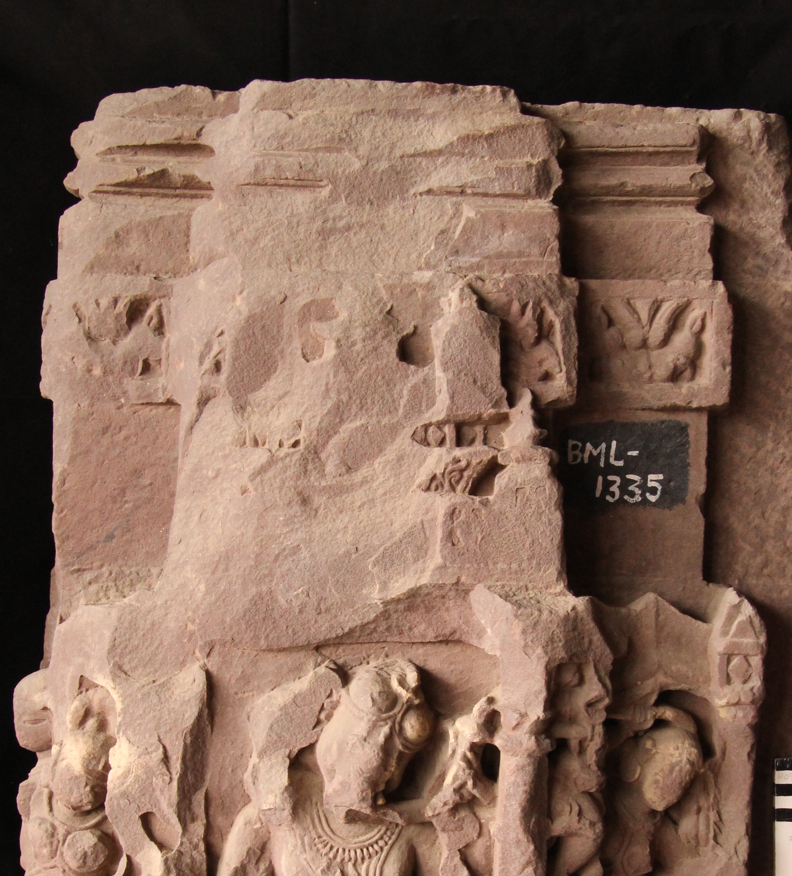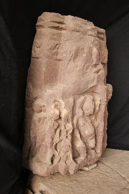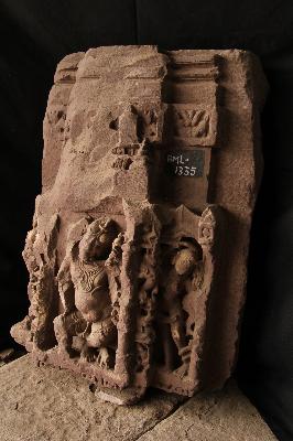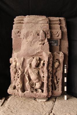 Architectural fragment carved with three standing female figures on sides and four-armed dancing Ganesha on from side Sardula figure and kirtimukta figures are also seen. Badly damaged.