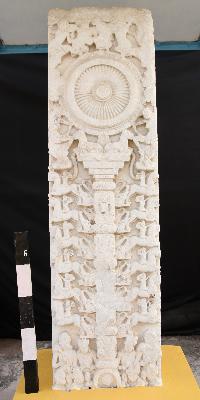 | Description / विवरण | The pilaster shows the worship of Dharmachakra. Four devotees were below. The Dharmachakra is represented in the centre, and horse riders are on both sides. The Pilaster is highly ornate and badly abraded. |