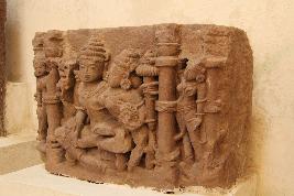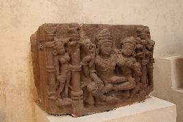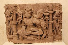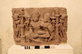 | Description / विवरण | Vishnu Laxmi seated on ardhparyanka asana in amorous mood. Laxmi is seated upon the left thigh of Vishnu and her right hand is held at the shoulder of Vishnu. Vishnu is four armed and carrying padma and gada in his upper right and left hand respectively while Goddess Laxmi carries chakra in her right hand. They are adorned with various ornaments. |