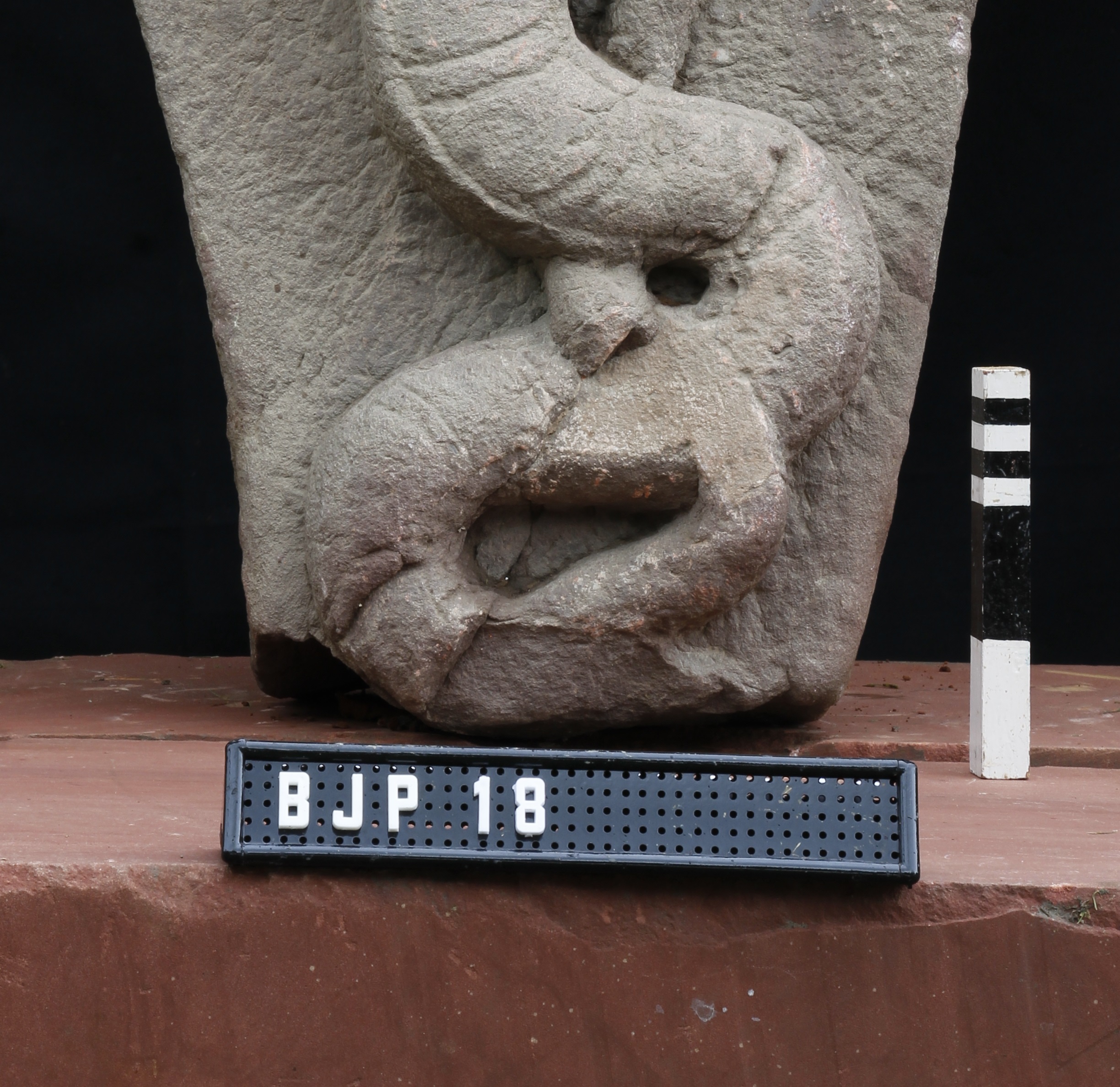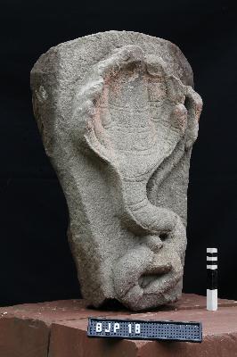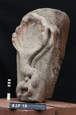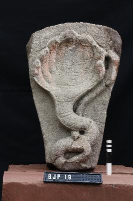 Image of a seven-hooded serpent with a long-coiled tail going parallel to the hood. A coating of red color may be vermilion is present in the hood portion.