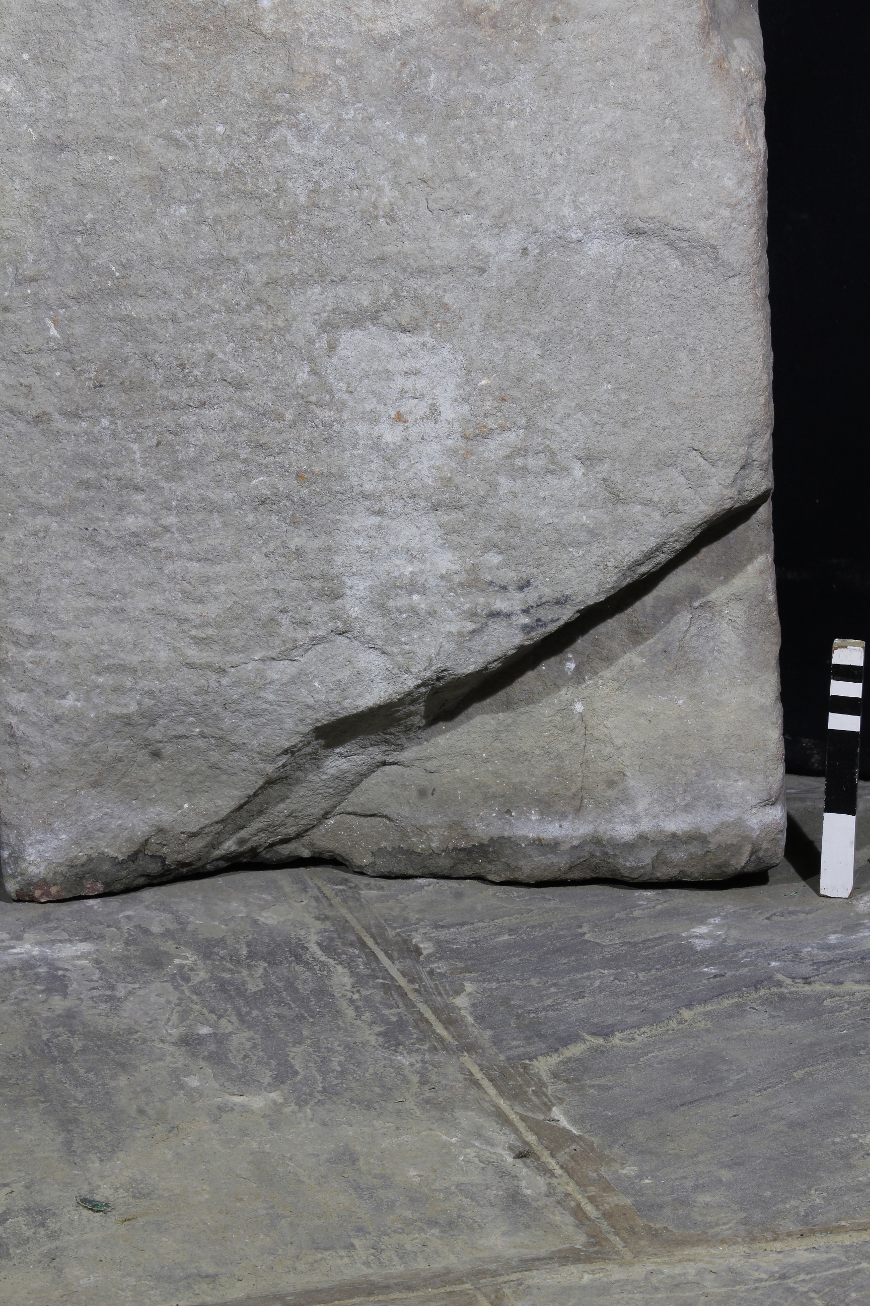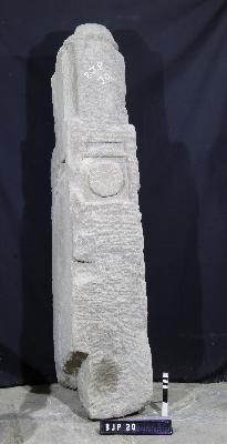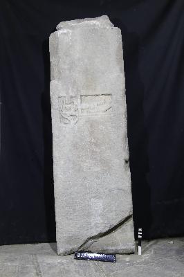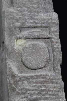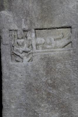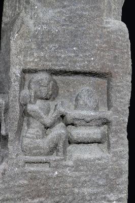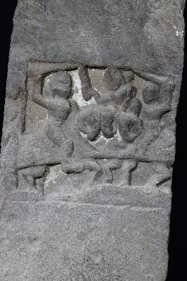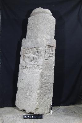 The Sati pillar is carved in all four directions and topped with a semi-circular design. A ridge is carved below the top. The sati scene is carved in the middle parts of the pillar. First side contains a scene of three horse-riders having dagger in their hands are shown in fighting posture. On the right side of this scene moon and sun are carved. On the left of this scene a shivlinga with jalahari is carved which is being worshipped by a female devotee. On the fourth side a lady in sleeping posture and a four-armed deity in ardhaparyankasan pose is carved to the left. Above the fighter s scene, there is an inscription in later Devanagari character.