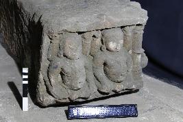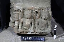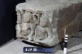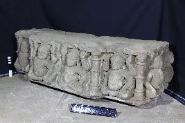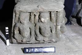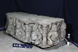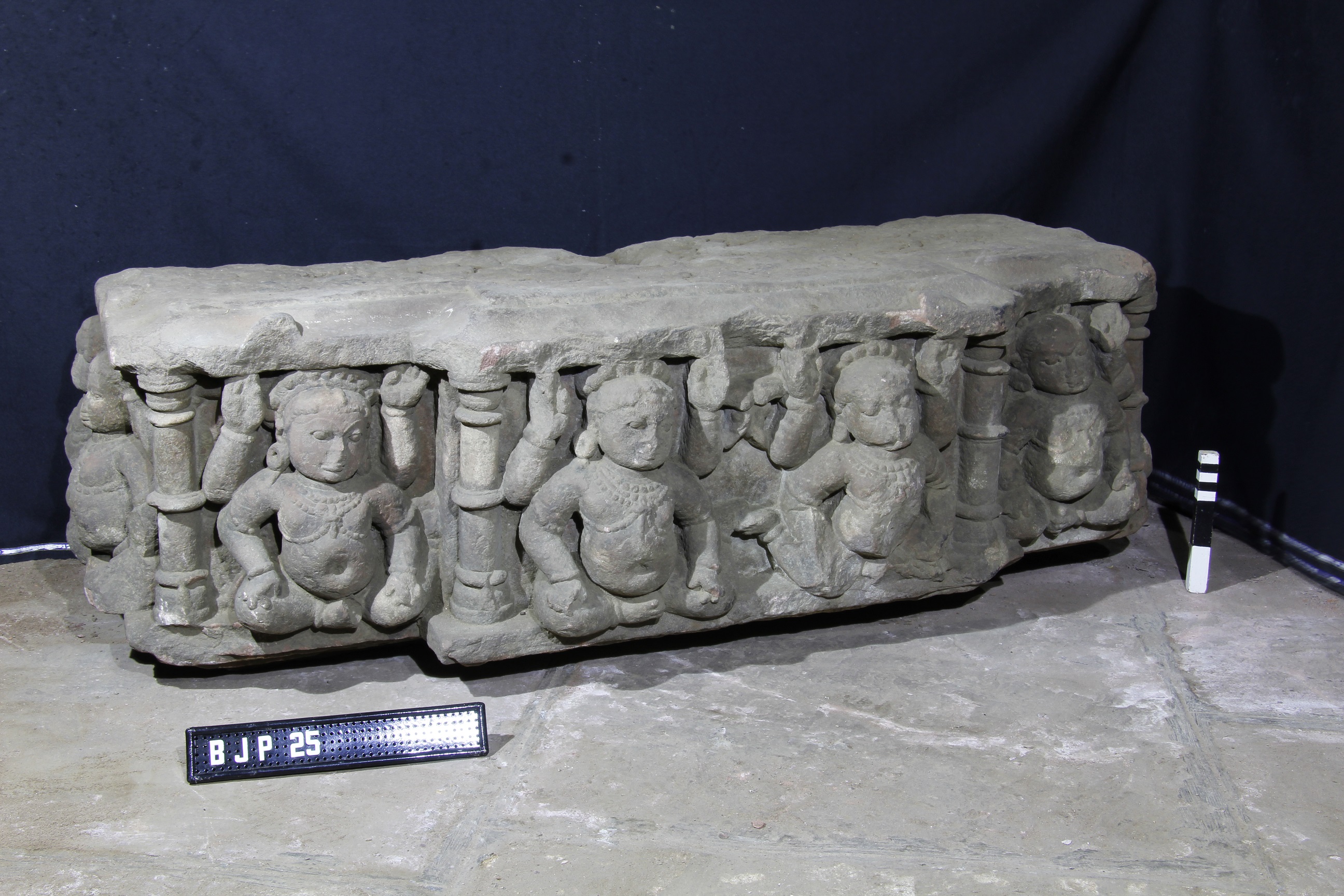 An architectural member carved with four-armed ganas in three sides, supporting the weight with his rear raised hands. In the front side there are four numbers of ganas are shown while on the right and left sides two numbers of ganas are shown.