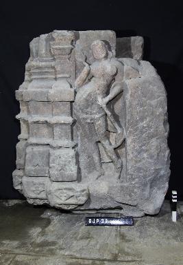 A standing image of female chauri bearer in tribhanga pose carved in a niche having decorated pillars towards the right side of the image.