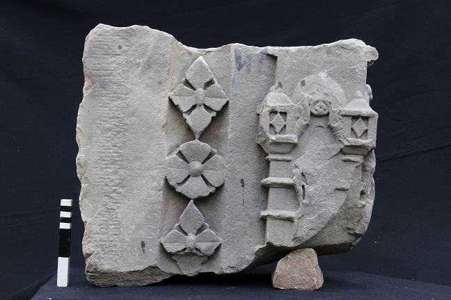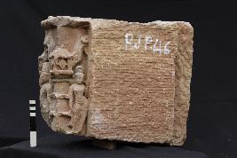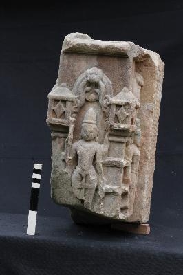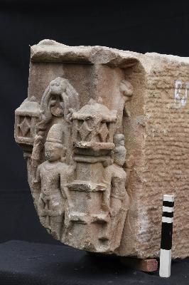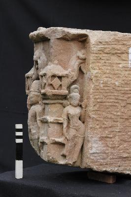 An architectural fragment carved on three sides bearing images of male and female associated with Siva sect within the Toran crowned with Kirtimukha and floral designs. In one face of the architectural fragment a lady standing in dvibhanga pose has dhammilla hair coiffure. Towards the left of lady image, a pilaster topped with a niche containing diamond. The second side a male standing between the two pilasters while third side comprises a chopped image within the two pilasters and floral design in vertical manner.