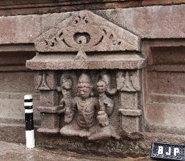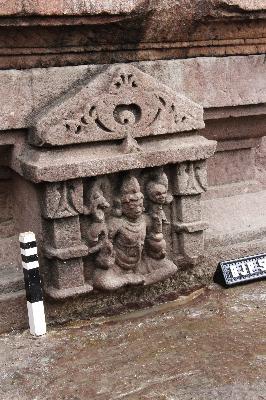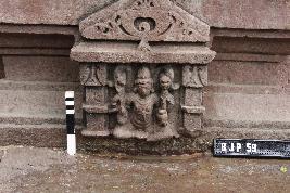 | Description / विवरण | A seated image of Siva in a miniature niche below the image of God Siva, wearing jatamukuta and yajnopavitam. This image is in ardhapriyanka asan, holding snake in upper right hand and Kapaldanda in upper left. Akshamala in lower right hand and Kamandala in lower left hand. Fixed under the pedestal of the big image of Siva Vide Sl. No. 58. |