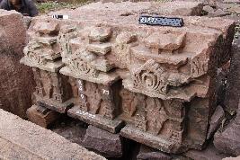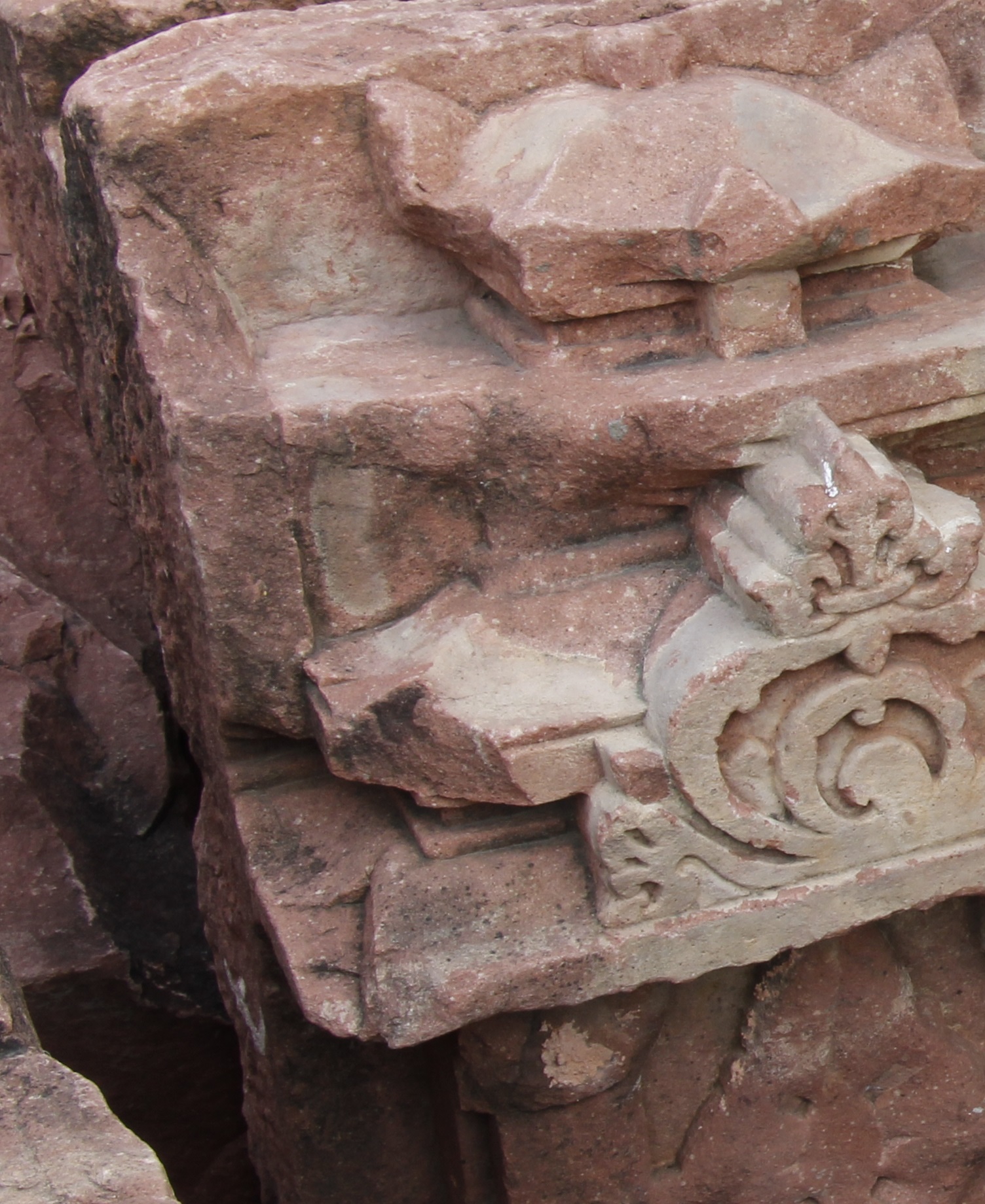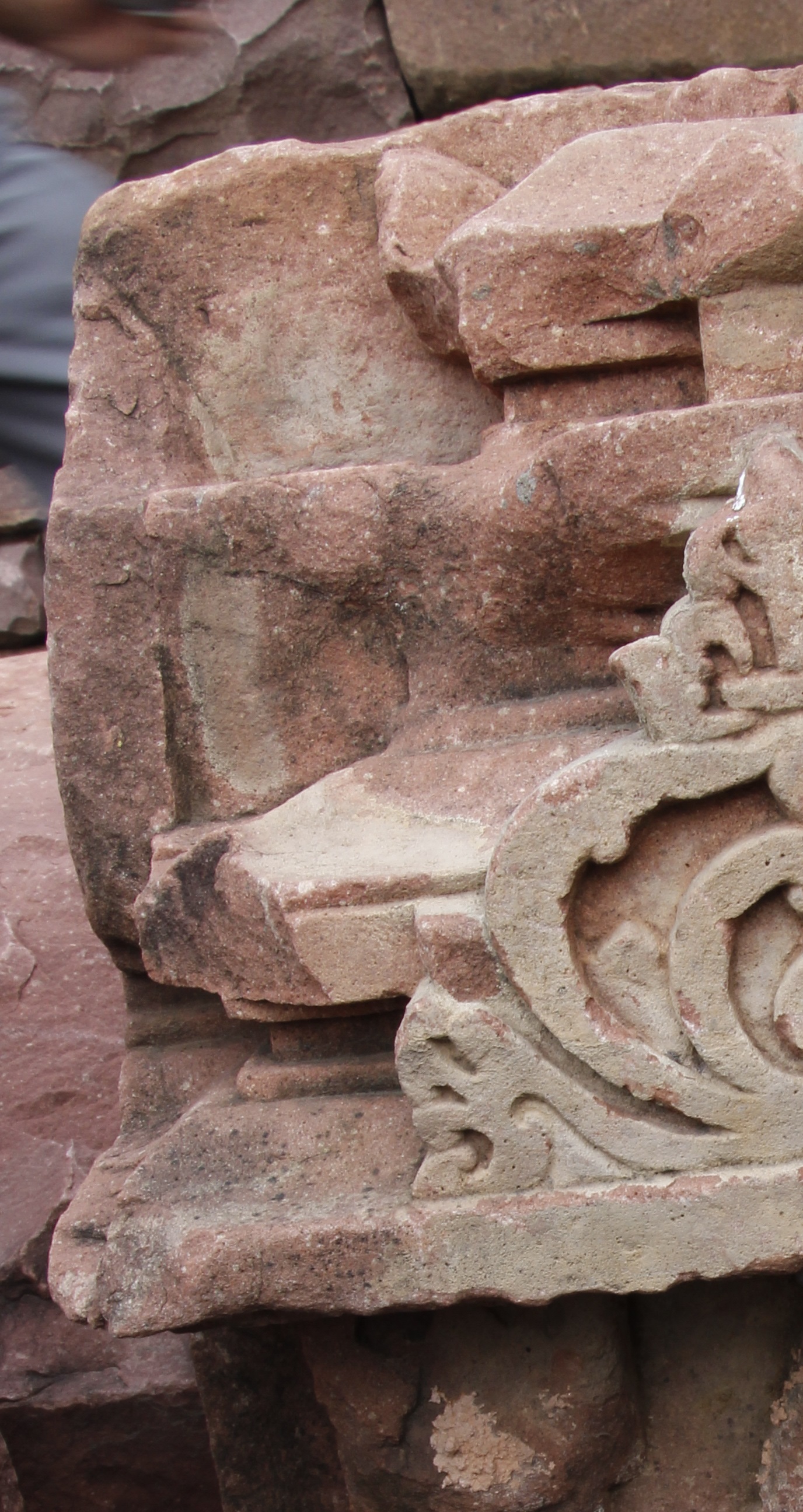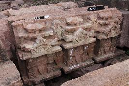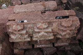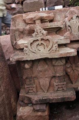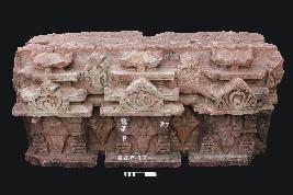 An architectural piece of a temple contains a floral design on its frontal side. Some mini shikharas on each of the front floral designs.