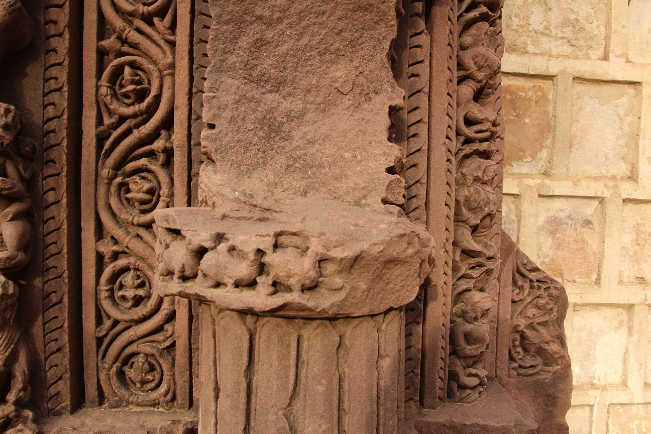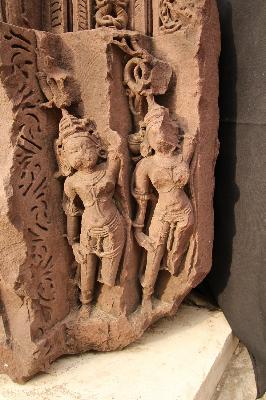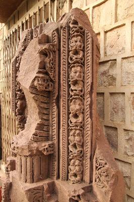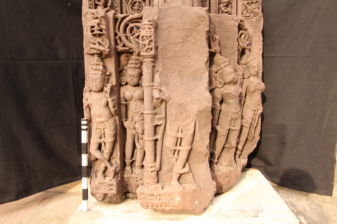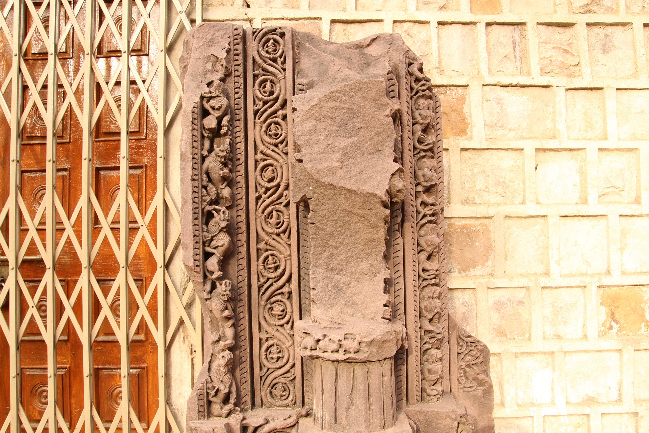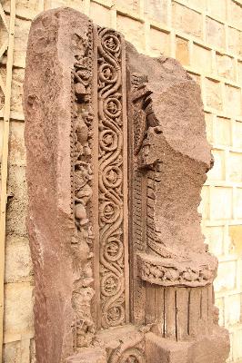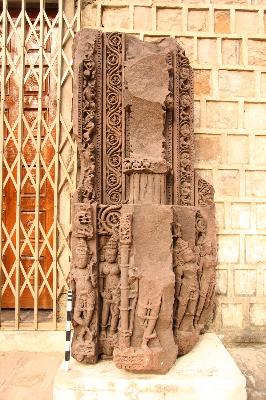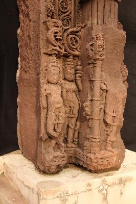 Part of the door jamb contains four sakhas and four male and female figures on the lower part. First sakhas is naga sakha carved with vega and nagi figures. Third sakha is carved with floral design and fourth is carved with floral and ghatapallava design is badly damaged though in projection form. The human figures are broken and chipped off. No iconographic features are available. The whole fragment is badly damaged.
