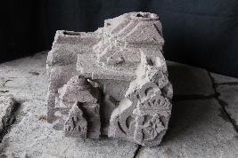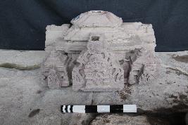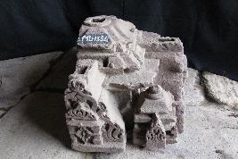 | Description / विवरण | Architectural fragment probably part of sikhara bearing flower design and temple design the alphabet is written on the top portion in Devanagari character mutilated. It must have been a part that could have been fixed somewhere. That is why some holes are visible at the top in order to attach it to a part of the temple. |