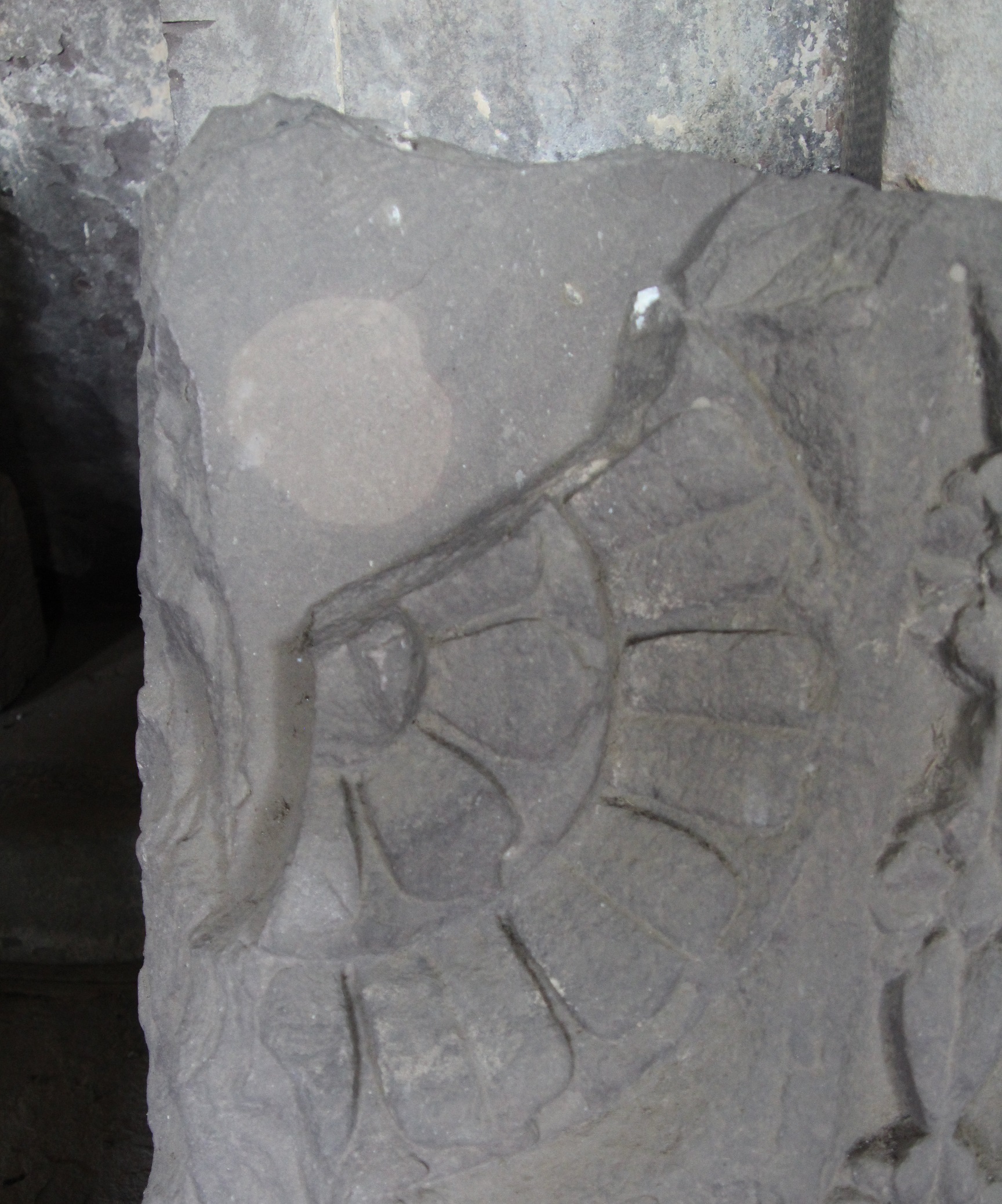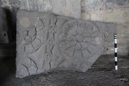 Architectural fragment carved with flower petals. Badly damaged.