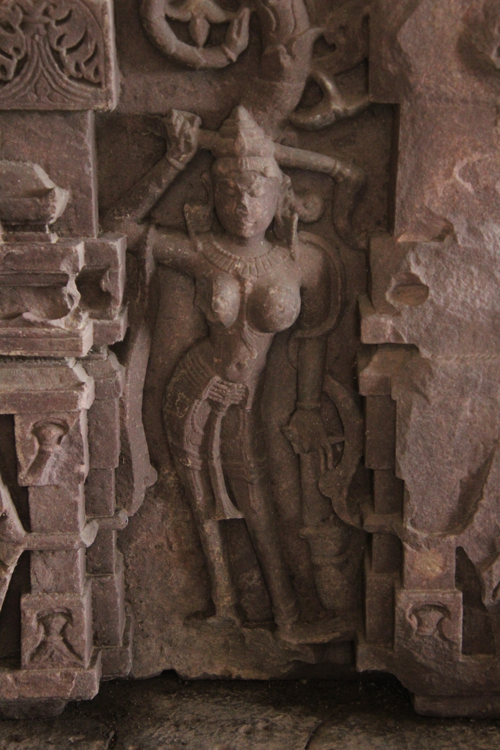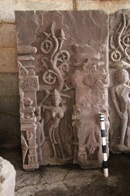 Architectural fragment bearing a standing female figure under a flower plant Salbhanjika. She holds in her raised right hand fly whisk and left hand placed on a pedestal. Breast broken.