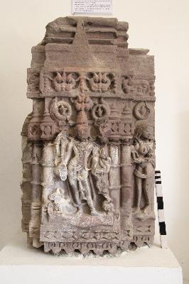 Four-armed lord Siva stands in Sambhanga posture, the attribute in his hands is not clear but his mount bull is shown seated at the lower right side of him. He is adorned with various ornaments and jata-mukuta.
