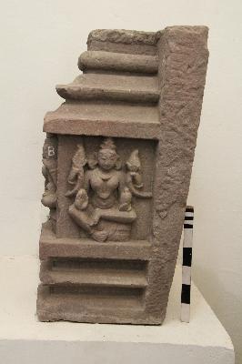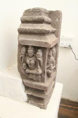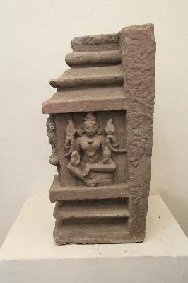 Panel depicted with two sculptures; one at the front is a female deity, who is four-armed holding lotus buds in her upper hands while the lower right hand is in Abhaya mudra and she holds a kalasha in her lower left hand. The other sculpture carved at the left side is of Goddess Parvati; who is four armed, upper right and left hands hold trident and khatavanga respectively, while her lower left hand is in Abhaya posture.