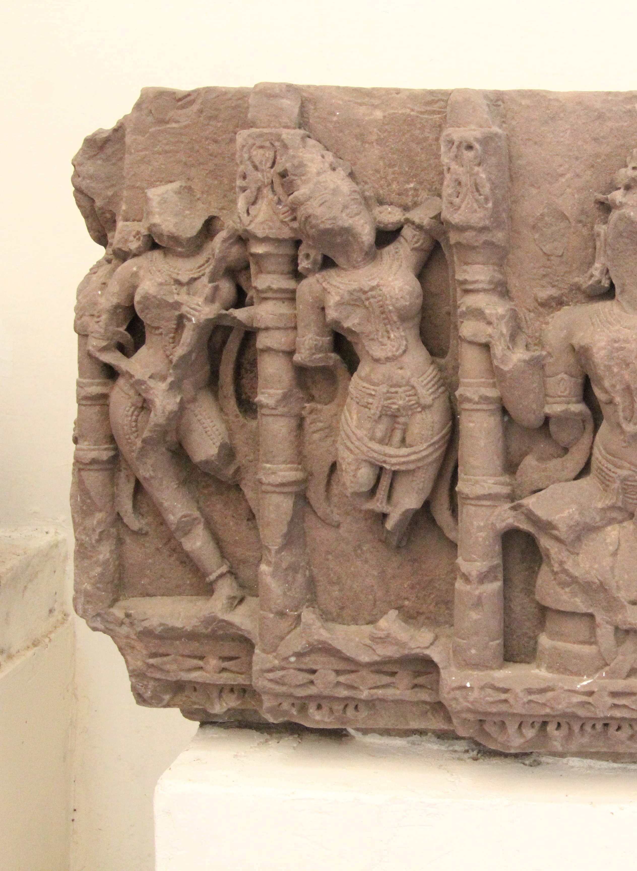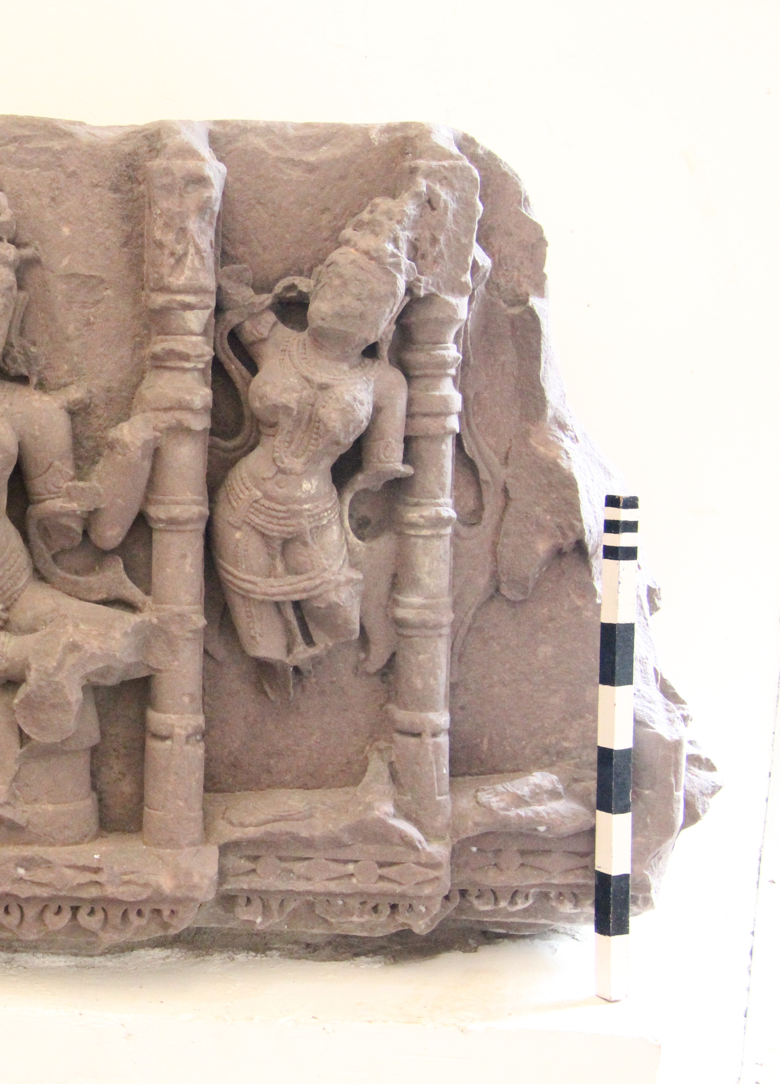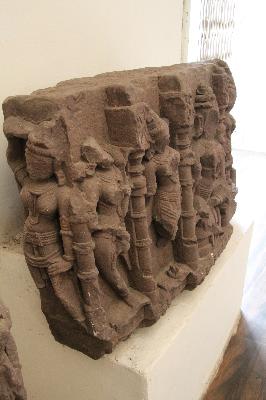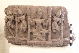 Architectural fragment bearing a four-armed deity seated in lalitasana pose in the centre encircled by a pilaster. One standing female attendant on each side and a faceless Saraswati figure on right corner is seen. Ornamentation is present with every figure but badly mutilated faces chopped off, hands, legs of figures broken Badly damaged.