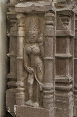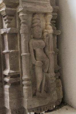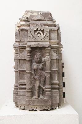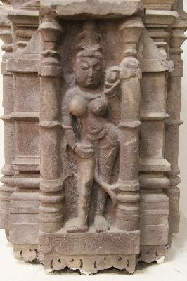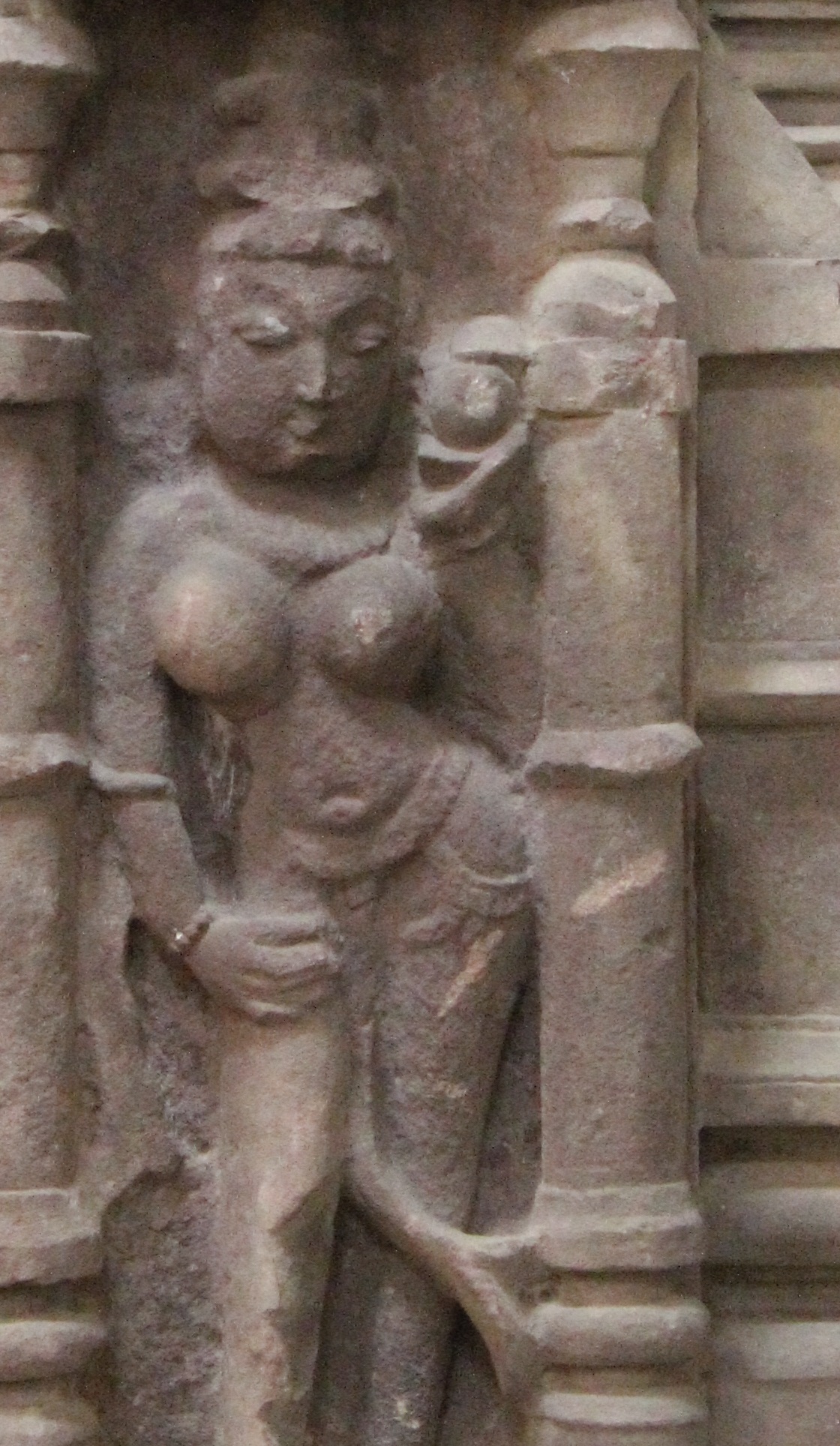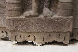 Standing Apsara in tribhanga posture on all four sides of panel. All are carrying kalasha in her left hand which extends upwards. There is something written in the panel below the feet of one of the Apsara.