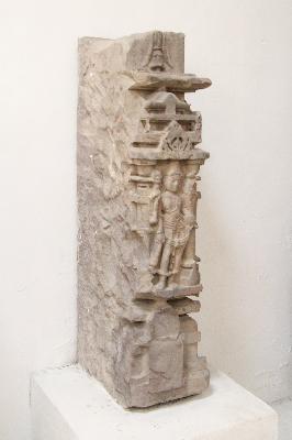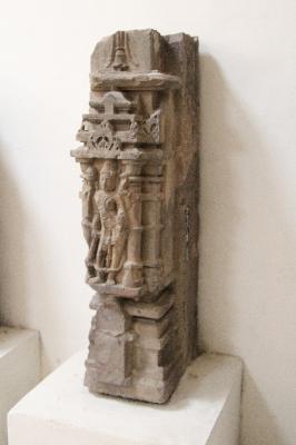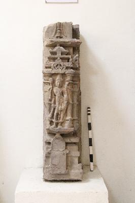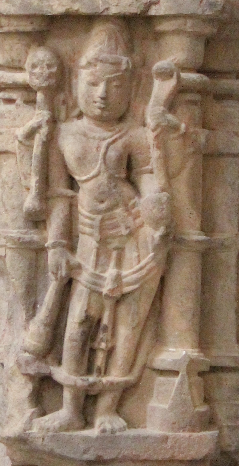 Four armed Dikpala wearing Jata-mukuta. He carries a khatwang and a snake in his upper right and left hands respectively while a matulinga and a gada are seen on his lower left and right hand, respectively. The deity is also adorned with yagyopavita & long Vanamala. The figure seems to be of Dikapala Ishana.
